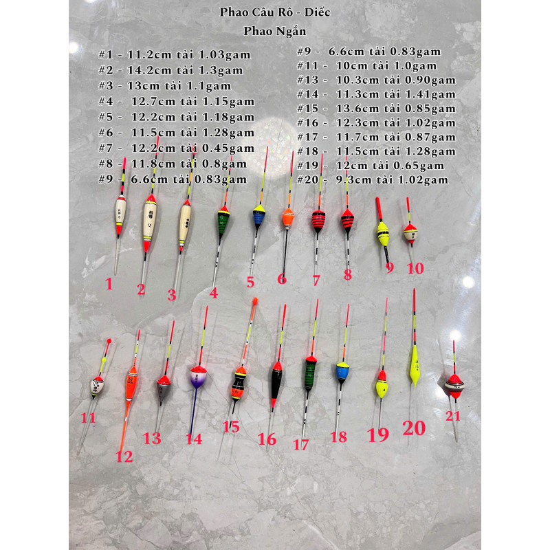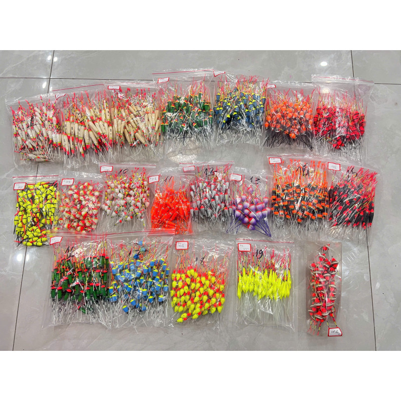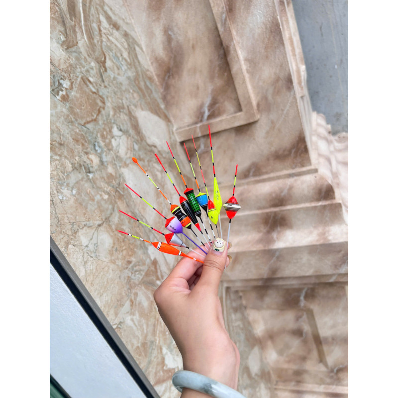 Thông số: • Số lượng: 12 phao ngày + tặng kèm 2 phao đêm • Dòng phao: Câu rô • Tải chì: 1.3g..